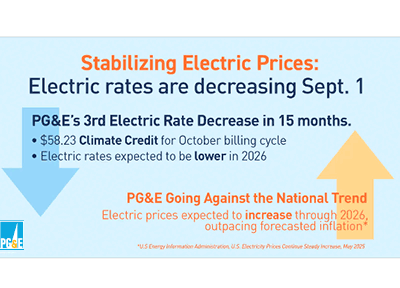 PG&E, 9월 주거용 전기 요금 인하, 10월 전기 청구서에 캘리포니아 기후 크레딧 지급